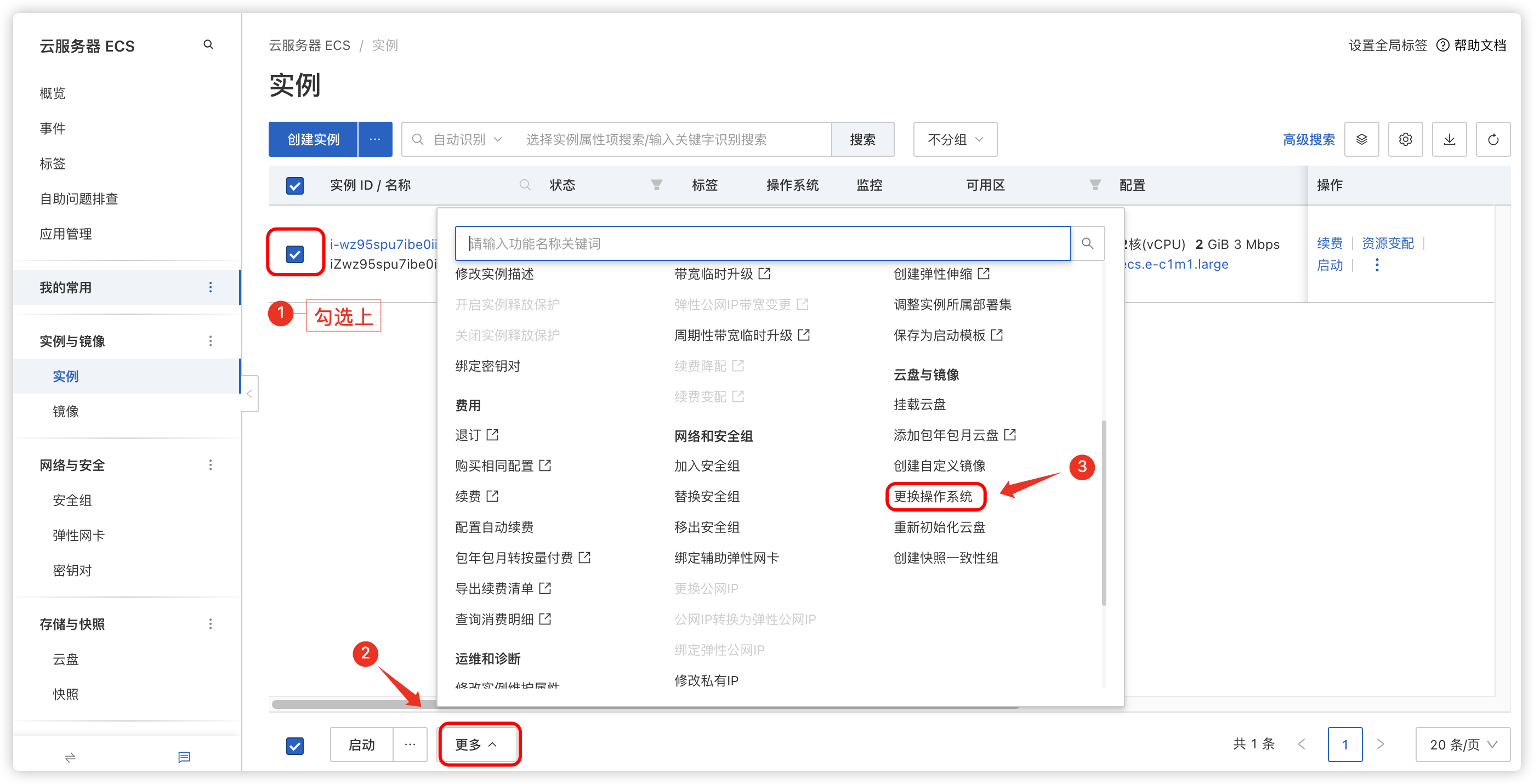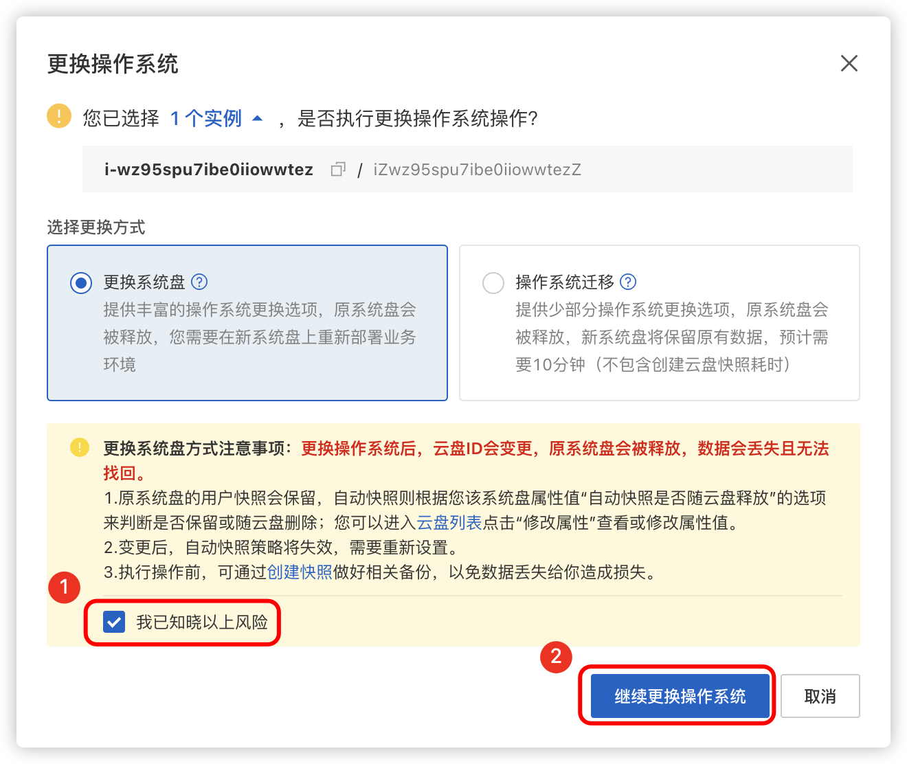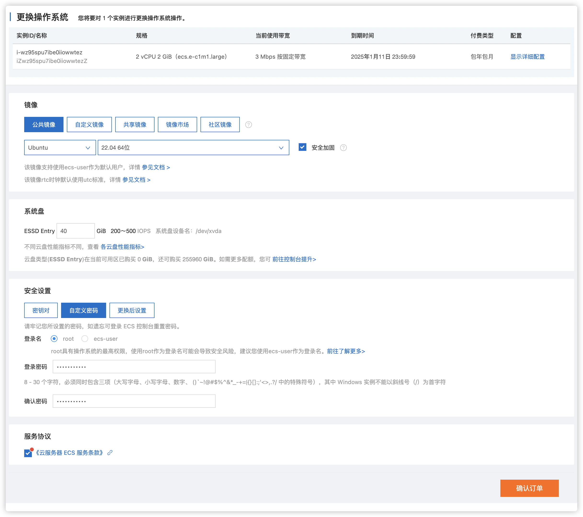 [TOC] #### 1. 前言 --- 有些客户购买服务器时可能随便勾选的服务器操作系统,但并不适合部署我们的现有项目,或者当前已经有一个服务器,服务器上面的东西都不需要了,我们想要一个干净的系统,重新安装一些东西,都可以参考本文步骤 阿里云服务器支持免费更换操作系统,参考本文流程即可,页面或许有些许变化,但操作位置不会改变 #### 2. 更换操作系统 --- 在更换服务器的操作系统之前,需要先将服务器关机,让其安全的关闭所有工作  点击服务器列表操作中的【三个点】和下方的【更多】都可以,找到并点击更换操作系统  确认要更换操作系统的实例,并勾选【我已知晓以上风险】,点击【继续更换操作系统】  进行以下配置,然后点击【确认订单】 | 配置 | 说明 | | ------------ | ------------ | | 镜像 | 使用公共镜像,镜像系统类别选择【Ubuntu】,选择操作系统版本【22.04 64 位】 | | 安全设置 | 选择自定义密码,设置输入 root 用户的密码 | | 服务协议 | 勾选上,代表同意服务条款 |  最后,获取短信验证码,点击【确定】即可完成操作系统的更换